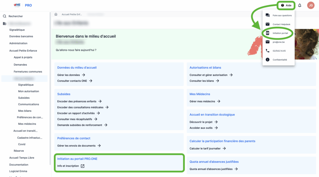 - Depuis le tableau de bord du milieu d’accueil, en cliquant sur « Initiation portail Pro.ONE » ;